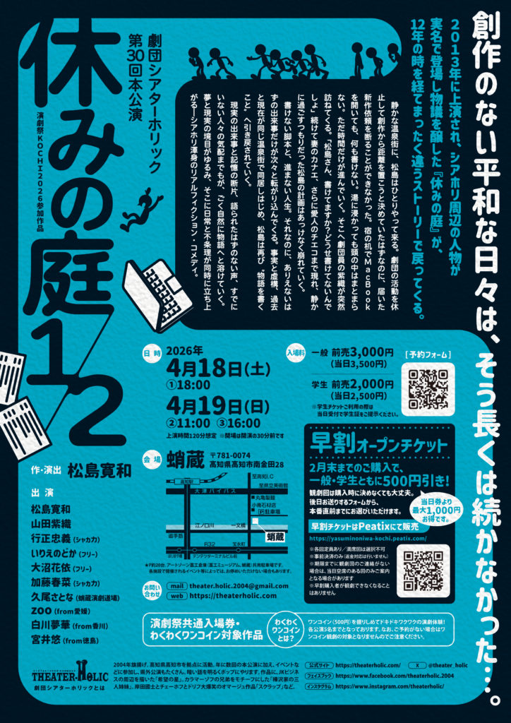2013年に上演され、シアホリ周辺の人物が実名で登場し物議を醸した『休みの庭』が、12年の時を経てまったく違うストーリーで戻ってくる。